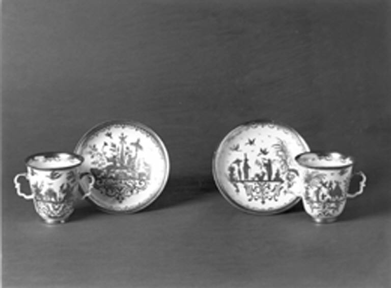 Decorazione con motivo "a merletto" lungo il bordo della tesa e doppio profilo in oro sul retro, lungo il piede e la tesa stessa.\nIl decoro dipinto in oro su fondo bianco è a cineserie (bevitori di tè, scene di caccia , uomini all'aperto).