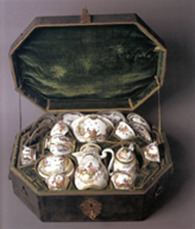 Servizio composto di una caffettiera, una teiera, un vaso porta tè, una ciotola, una zuccheriera, sei tazzine con piattini. Il servizio è contenuto in un bauletto di pelle con due manici laterali, ganci, cerniere e serrature con chiave di metallo dorato; l'interno è di velluto verde con profili di passamaneria dorata. \nNel velluto del rivestimento interno sono presenti fori e sedi per sette cucchiaini attualmente perduti.