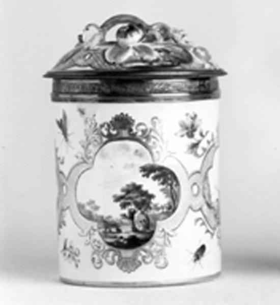 Scatola cilindrica dal coperchio bombato, con presa a ramoscello fiorito. La bocca della scatola e il coperchio è rifinita con ghiere di metallo dorato leggermente mondanate, con decoro a volute incise e a dentelli. La base è profilata in oro. Il decoro dipinto del corpo presenta quattro cartelle quadrilobate con paesaggi e scene di porto, ricche di cornici dorate a volute e decoro "occhio di pernice".\nSul fondo bianco delle zone rimanenti sono dipinti fiori del tipo "Deutsche Blumen" e insetti vari. Sul coperchio si trovano scene di porto accanto a scene a soggetto galante.\nLa policromia è molto ricca: le prese del coperchio sono dipinte nei colori verde, giallo, azzurro, rosso-ferro e rosa-viola, ripresi anche sul corpo, nel quale si aggiungono tonalità di marrone e grigio.