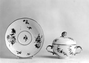 Tazza da brodo con coperchio. La tazza, su piede ad anello, ha due manici a orecchia decorati con volute "rocaille", modellati nella parte superiore in forma di ramoscelli con fiori e foglie applicati. Il coperchio bombato, profilato in oro, offre una presa a pomolo in forma di fragola, con alta fascia in rilievo "Neue Ozier" entro partiture verticali.