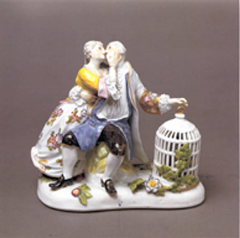 Gruppo che rappresenta due amanti seduti e abbracciati , colti nell'atto di baciarsi. Le due figure poggiano su base bianca con foglie e fiori policromi applicati, sull'estremità della quale è posta una gabbia che lascia intravvedere all'interno un uccellino. L'ampia gonna della dama è bianca con decoro dipinto "Indianische Blumen" in rosso-ferro, blu, rosa intenso, giallo, verde e oro; dal lembo sollevato della gonna spunta la sottogonna color verde-acqua. La sopraveste è gialla con l'interno color rosa intenso. Il cavaliere indossa pantalloni al ginocchio e scarpe, entrambi neri e profilati in oro, lungo "gilet" blu, camicia bianca e marsina bianca con profili dorati; sugli ampi risvolti delle maniche sono dipinti "Deutsche Blumen" policromi su fondo oro.