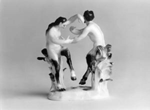 Gruppo di fauni danzanti su piccola base bianca con foglie verdi applicate e elementi vegetali palustri che sostengono le due figurine. Tocchi di grigio nei capelli e nelle zampe dei fauni.