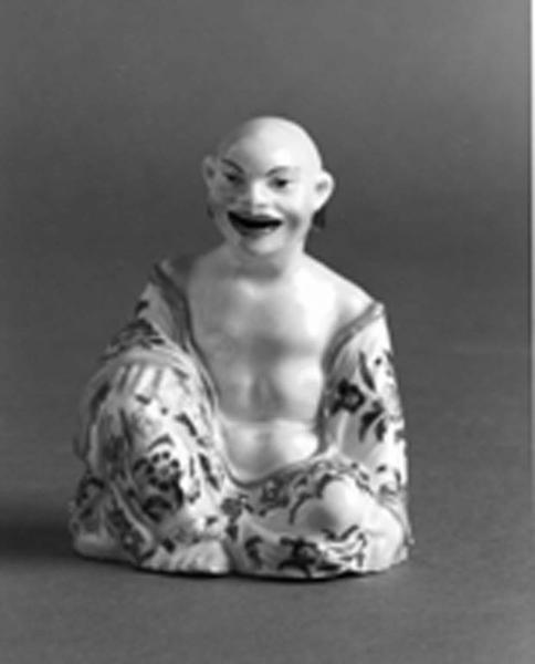 Statuetta a figura da pagoda con veste bianca a bordi lilla profilati in oro e fiori sparsi policromi (rosso-ferro, blu, giallo, lilla, verde)