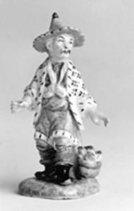 Figura maschile di cinese in miniatura su base quadrangolare verde screziato di marrone, dalla quale si alza un piccolo sostegno dello stesso colore. Il costume è costituito da pantaloni verdi infilati in stivaletti neri, veste color rosa intenso a piccole scaglie bianche, fiocco giallo al collo, giacca aperta bianca con fiorellini geometrici gialli e rosa intenso e con bordura bianca e nera che frastagliata, è verde con l'alta punta dorata.\nSulla base sulla sinistra dell'uomo, è posato un braciere che sprigiona fiamme gialle e rosse.\nSotto la base non verniciata è praticato un foro ovale