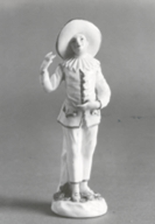 Statuetta di Pierrot su base bianca con sostegno bianco in forma di tronco, fiori e foglie policromi applicati. La figura è nella consueta posa composta, con pantaloni e giubba abbottonata bianchi, entrambi profilati in oro, gorgiera bianca, cappello a larga tesa bianco, profilato in oro. Le scarpe sono gialle con fibbie dorate.