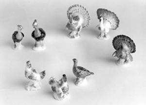 Serie di tredici volatili in miniatura su basi bianche con screziature verdi: I tacchini e il pavone hanno tutti la coda aperta. La policromia comprende il marrone tendente al giallo, il grigio chiaro, il verde, il blu, il nero con tocchi di rosso, lilla, violetto, azzurro e beige.