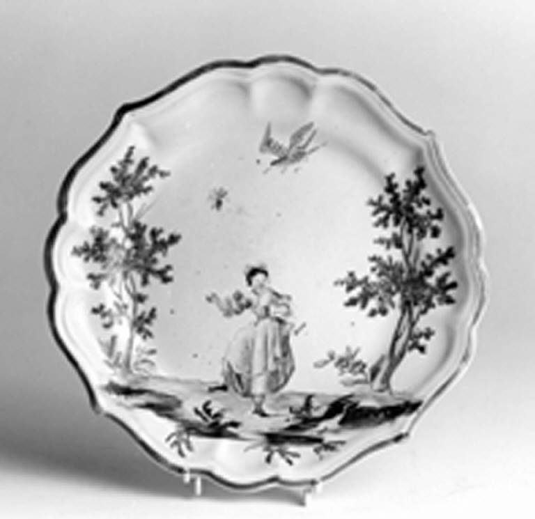 Piatto tondo con orlo mistilineo senza anello d'appoggio.\nIl decoro "a paesini e figurine" occupa la parte centrale del piatto