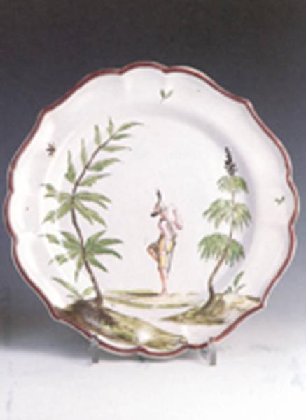 - NOTIZIE STORICO CRITICHE Questo piatto mostra caratteristiche particolari che lo distiguono dalla consueta produzione "a paesini e figure a smalto": Lo smalto mostra una fitta puntinatura più sottile e quindi assume un tono rosato, lasciando trasparire il colore della terracotta sottostante. Gli alberi sono diversi: non faggi, ma piante esotiche. Non c'è il volatile ma sono presenti due semis a fogliette. La stesura del colore è a piccoli tratti asciutti accostati, mentre normalmente è molto più acquerellata e morbida. Infine la composizione del terreno è formata da tre zolle accostate, mentre solitamente è più unito.\nSeppure non sorgano dubbi sulla loro autenticità, questo piatto "diverso" può essere o il lavoro di un pittore nuovo della manifattura dell'Ospedaletto di S.Ambrogio che vuole così dimostrare la sua originalità o semplicemente pezzi tardi.