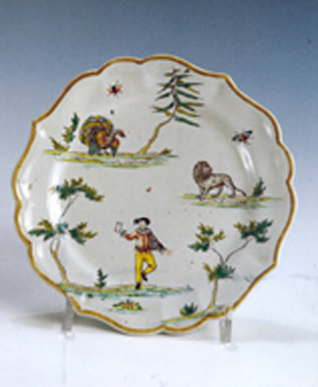 - NOTIZIE STORICO CRITICHE Piccolo piatto appartenente ad una evoluzione stilistica del "decoro a paesini e figure" dove le zolle si moltiplicano riducendosi notevolmente di dimensione per lasciare respiro al biancore dello smalto. Sui piani secodari compaiono animali. Gli alberelli si assottigliano e ai faggetti fanno spesso compagnia pini molto stilizzati, all'orientale. Gli insetti in volo diventano farfalle molto più curate del solito sia nel disegno che nella cromia. In questa serie talvolta troviamo ai piedi delle figure un curioso fiore stilizzato, posto a terra, scorciato.\nE' evidente che le incisioni sono sempre a disposizione dei pittori dell'Ospedaletto che ne attingono copiosamente per le loro figure. Non tutte sono state ancora riconosciute dagli studiosi.