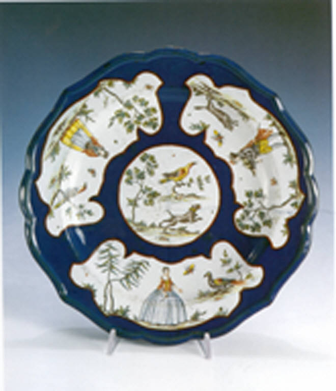 Grande piatto tondo dall'orlo mistilineo, stretta tesa e dolce balza con il verso, senza anello d'appoggio, totalmente smaltato blu. Il decoro a paesini e figure a smalto blu si svolge in quattro riserve: tonda al centro con tre piani terrosi che ospitano un cane abbaiante, un uccello su un ramo e un alberello. Tra tesa e balza si adagiano le tre riserve dal profilo mistilineo a fisarmonica.