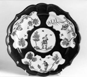 Piatto piano dal profilo mistilineo senza anello d'appoggio. Piatto da coltello con il retro totalmente rivestito di smalto blu cobalto. Il motivo "a paesini e figure" è ospitato in quattro riserve, una tonda al centro del piatto e tre a fisarmonica.