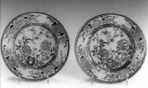 Piatto fondo in maiolica dalla sottile parete rivestita di smalto stannifero. Lungo l'orlo liscio corre una sottile fascia rossa con un leggero rabesco in oro. La parte centrale , la tesa e la balza sono decorati con motivi floreali. Due peonie e due crisantemi rosa lampone contornati da fiori minori decorano la tesa. Sulla balza una larga fascia a piccoli rombi, interrotta da quattro riserve con peonie colorate alternativamente in rosa e verde delimita il fondo. Qui un forte ramo porta dei piccoli fiori di pesco e ciliegio, margherite e due grandi peonie. La tavolozza è dominata dalle tonalità del rosa, colore principe della gamma cromatica a piccolo fuoco derivato dalla porpora di Cassio. Il bianco dei fiori di ciliegio è in sottile rilievo.