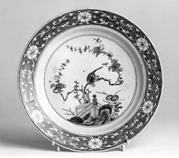 Piatto tondo dall'orlo liscio. La scena centrale della decorazione interessa la parte centrale del piatto.\nPer imitare l'effetto della porcellana lo smalto è leggermente azzurrato. La tavolozza cromatica è caratteristica, oltre alla nota dominante detta del rosso ferro del bordo, vede colori duri e freddi: un grigio azzurro, verde blu, verde, giallo e manganese.\nLa fascia ornamentale con fiori e steli a lira riservati su fondo rosso.