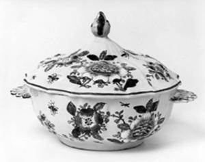 Piccola zuppiera dal corpo costolato con anello d'appoggio, anse a mensola dal profilo a ventaglio; coperchio costolato con orlo mistilineo e presa a bocciolo. Lo smalto è brillante leggermente azzurrato. Il decoro è a fiori in rilievo. L'orlo è listato in bruno-rosso.
