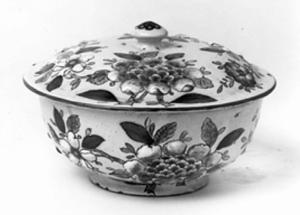 Ciotola dall'orlo liscio e anello d'appoggio modellata al tornio con coperchio dal largo bordo liscio e presa a bottone decorata a fiori a rilievo. Sul pomello è dipinto un fiore rosso-blu. L'orlo è listato in rosso-bruno
