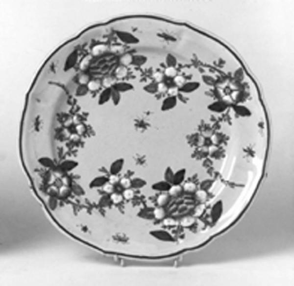 Piatto da coltello dall'orlo mistilineo senza anello d'appoggio decorati "alla barbotttina" con motivo floreale a rilievo e numerosi insetti in volo.\nLo smalto , leggermente azzurrato, è molto sottile e lascia trasparire il colore della terracotta rosata sottostante.