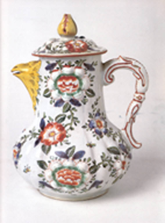 Caffettiera dal corpo periforme baccellato con alto collo, ansa a doppio ricciolo, versatoio a muso di grifo, basso coperchio con presa a bocciolo. Consueta forma tipicamente milanese modellata a stampo. Il versatoio a muso di grifo è nella versione più addolcita, dipinta in colore chiaro con bordi lobati da cui escono ciuffi di microscopiche foglie. \nIl decoro a fiori a rilievo detto "alla barbottina" è articolato su quattro tralci fioriti. Gli orli, i profili e il gioco ornamentale sul manico sono in bruno-rosso.