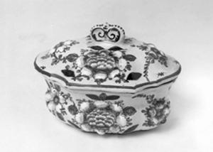 Zuccheriera ovale dal profilo mistilineo, coperchio con presa a corona. Il decoro a fiori a rilievo detto "alla Barbottina" è articolato su due rami fioriti sull'invaso e due sul coperchio.\nGli orli e i profili decorativi del pomello sono listati in bruno-rosso.