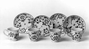 Tazzina a campana dall'orlo estroflesso su base ad anello svasato e ansa ad orecchio. Lo smalto si presenta leggermente azzurrato. Il decoro a fiori a rilievo vede un ramo fiorito avvolgere il corpo della tazza. L'ansa è ornata di una catena di fogliette a virgola dipinta in rosso bruno. Con lo stesso colore è listato l'orlo superiore dell'invaso.
