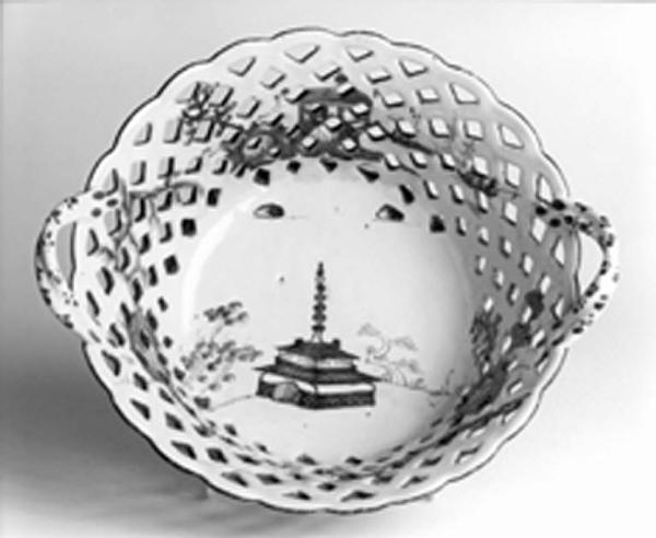 Cestina modellata a stampo dalla parete traforata ad imitazione di un intreccio di vimini, orlo superiore polilobato e base a disco. Le prese sono formate da due rami intrecciati. Il motivo "a carabiniere" vede al centro del fondo la pagoda cinese e sulla parete gli altri elementi del decoro. Sulle anse si notano i motivi a fioretti stilizzati in rosso ferro.