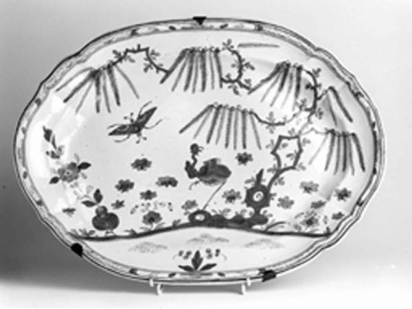 Piatto ovale dal bordo mistilineo, leggermente riservato e senza anello d'appoggio.