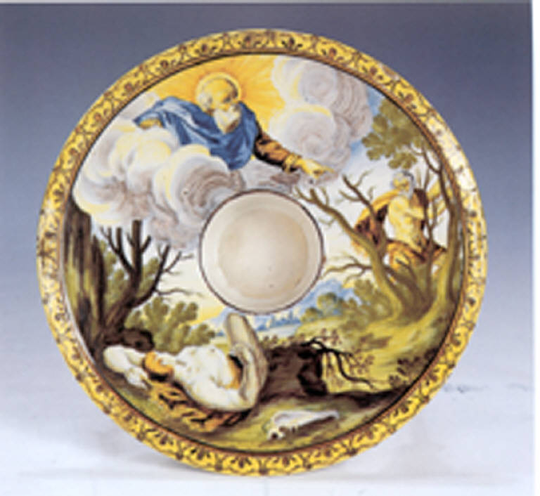 - NOTIZIE STORICO CRITICHE Dal punto di vista iconografico alcuni elementi provocano perplessità: innanzitutto la figurazione di Caino anziano e inoltre il fatto che accanto al corpo di Abele visto di scorcio in primo piano vi sia una mascella d'asino. L'unico episodio biblico in cui sia espressamente citata quest'arma è il passo del libro dei Giudici (15,15-15,17) in cui Sansone contro i Filistei afferma: "con la mascella d'asino, /ho colpito mille uomini".\nMa quest'osso è spesso rappresentato come arma "bestiale" in mano a tritoni o satiri in raffigurazioni mitologiche rinascimentali come si può osservare in celebri incisioni: Mantegna e Durer, Lotta dei tritoni o ancora Durer; Combattimento della Virtù e del Piacere e spesso anche in mano a Caino, come nell'icisione anonima tratta da un'opera di Jean Cotelle con questo soggetto, sicuramente nota a Castelli perchè fonte della decorazione di altre maioliche castellane. Anche l'anzianità di Adamo è talvolta riscontrabile su altre ceramiche della stessa provenienza. Sicuramente anche la nostra composizione trova la sua origine in una fonte incisa, purtroppo non rintracciata.\nTra i numerosi maestri attivi a Castelli spesso il riconoscimento delle mani non è affatto semplice, come in questo caso.
