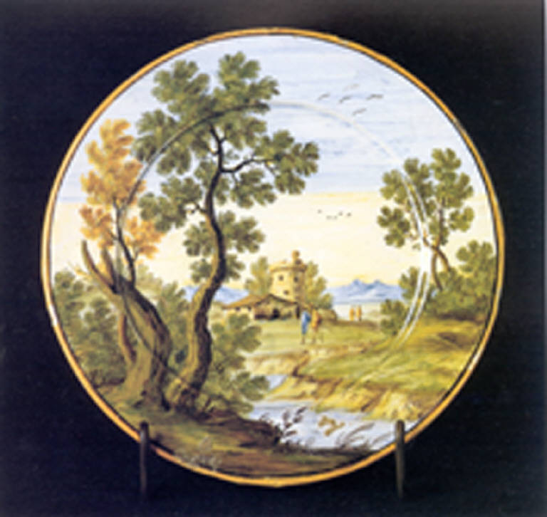 - NOTIZIE STORICO CRITICHE Nella produzione di Castelli d'Abruzzo è frequente incontrare piattelli a soggetto paesaggistico. Se le fonti erano spesso fogli incisi francesi, soprattutto dei fratelli Perelle, sono note anche stampe prodotte espressamente per questa destinazione come l'incisione firmata Francesco Antonio Grue.