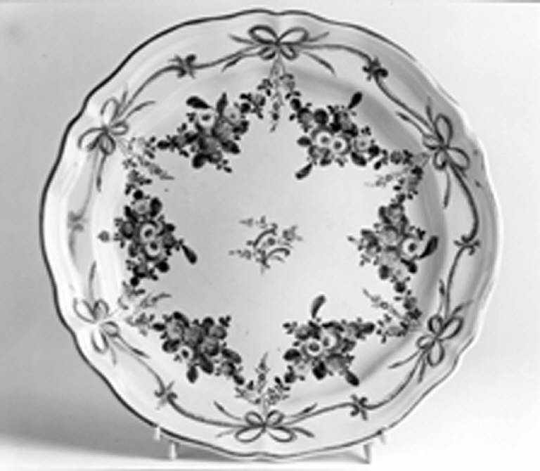 Piatto, senza anello d'appoggio, con la tesa rialzata dal profilo esalobato. L'orlo è rilevato in oro.