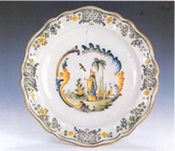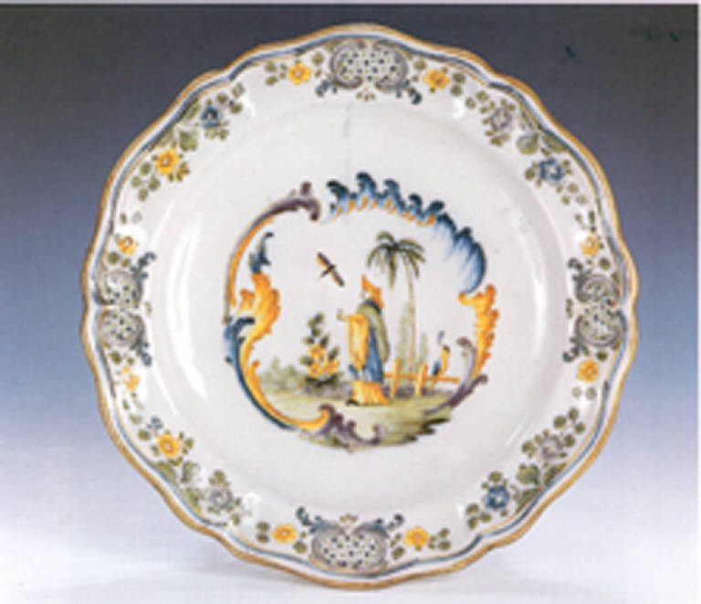 Piatto esalobato senza anello d'appoggio. La terracotta è color carne chiaro e il rivestimento di smalto molto sottile assume un tono leggermente beigiato. Il bordo, orlato in bruno, è accompagnato da un doppio filetto blu e bruno.