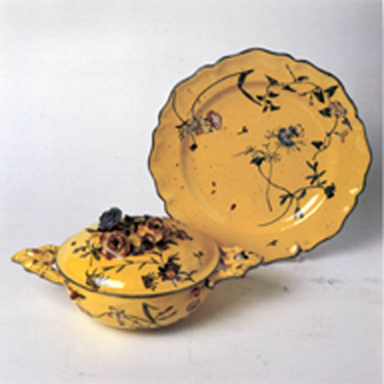 Tazza da brodo dal largo invaso dal profilo liscio, mostra due manici ad andamento orizzontale mossi da plastica rocaille. Sopra al coperchio a calotta ribassata fanno corona, a mò di presa, alcuni fiori modellati con naturalismo. La terracotta è a grana fine color beige-grigiastra. Lo smalto giallo mostra una leggera e diffusa puntinatura verde. I profili sono orlati in verde.