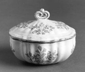 Zuccheriera dal corpo sottile, in terracotta rosata scura, leggera, rivestita con uno smalto povero.\nIl basso coperchio, dall'orlo mistilineo, è coronato da una presa a doppio ricciolo.