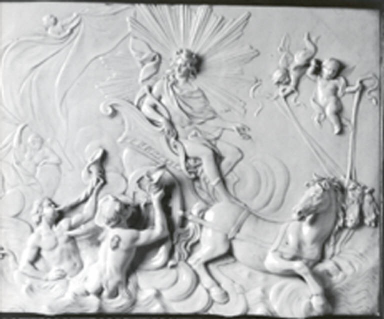 Placca istoriata a soggetto mitologico in basso e alto rilievo con parti aggettanti a tutto tondo.