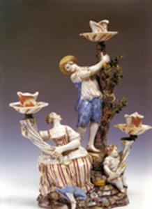 - NOTIZIE STORICO CRITICHE La modellazione della fronte e del naso delle figurine del gruppo in catalogo ripropone un tratto stilistico distintivo dell'opera di Giuseppe Bruschi, attivo nella manifattura fra il 1749 e il 1781.\nLa tipologia del gruppo, composto da diversi personaggi disposti intorno ad un albero, è quella della tradizione classica dei bronzetti italiani di età rinascimentale, rinnovata dall'intonazione campestre di gusto settecentesco. Si ricorda che la produzione di candelabri a cornucopia si potrae a Doccia fino alla prima metà del XIX secolo.\nLe scodelline reggi candela, con il sostegno metallico, sono invece da collocarsi in epoca successiva: Lo dimostrano dati tecnici relativi alla pasta, eterogenea rispetto a quella con cui è stato plasmato il gruppo, e stilistici, inerenti il decoro dipinto a fiorellini, ormai lontano dal tratto settecentesco. Con ogni probabilità, l'aggiunta delle suppellettili al gruppo è stata effettuata in epoca assai prossima a quella dell'acquisto da parte del Gianetti.