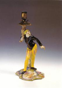 - NOTIZIE STORICO CRITICHE La tipologia del candeliere in forma di statuetta che sostiene un reggi candela tortile appartiene alla tradizione dei bronzetti italiani di età rinascimentale, mentre figure grottesche analoghe a quelle in catalogo ebbero una certa diffusione a partire dal secolo XVII. E' interessante il confronto con una statua in pietra serena collocata nel Giardino di Boboli a Firenze. L'opera, attribuita a Romolo Ferrucci del Tadda, datata fra il 1617 e il 1621 sembra imitare antichi mimi , forse eseguiti su disegni del Callot. Chiare appaiono le analogie fra l'esemplare di porcellana, la scultura del Ferrucci e l'acquaforte "I due Pantaloni " , acquaforte del Callot che appartiene alla serie dei Capricci, edita per la prima volta a Firenze nel 1617. La stampa costituisce un precedente per i Balli di Sfessania, serie di acqueforti pubblicata intorno al 1621, nella quale si ritiene che il Callot ritragga alcune delle maschere che animavano le strade fiorentine, nel corso delle feste promosse dal Granduca Cosimo II.
