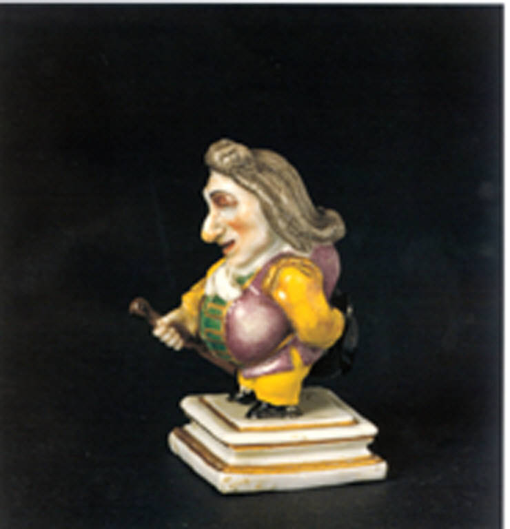 - NOTIZIE STORICO CRITICHE Il pezzo fu eseguito a Doccia, dove tali figurine, negli inventari dette "Caramogi", venivano create in serie di dodici o più pezzi. \nNell'invetario dei Modelli sono citati "...tre caramogi femmine...", mentre nella Tariffa dei prezzi, redatta presso la manifattura intorno al 1760 da Jacopo Rendelli, si legge "... Figurine rappresentanti Caramogi o Pimmei alte 2 soldi circa. Dette dipinte" Scrive il Ginori " Vari tipi di caramogi o pimmei venivano prodotti per ornare le mense nel primo periodo della manifattura. Il termine significa persona piccola, contraffatta e sciocca ed è riferito alle piccole figurine di nani alte circa cm. 7, probabilmente modellate da Gaspero e da Giuseppe Bruschi" anche negli anni successivi alla morte del Marchese Carlo.\nStatuette rappresentanti nani in diverse fogge , ispirate alle illustrazioni delle "Varie figure Gobbi" di Jacques Callot, edito nel 1616 a Firenze, furono prodotte nel corso del XVIII secolo da varie manifatture, quali Meissen, Doccia, Capodimonte e Cozzi. I Gobbi di Callot nascono da schizzi presi dal vero: la deformazione caricaturale, di intonazione satirica, traeva spunto, con ogni probabilità, dall'osservazione del reale. Infatti, le fonti del tempo riportano la consuetudine di organizzare giochi in occasione della Festa di S. Romolo, che si svolgeva ogni anno il 6 Luglio a Firenze. Per l'appunto, la Giostra dei Gobbi che si correva ogni anno, estendeva alla partecipazione popolare la predilezione di Cosimo II e di Maria Maddalena d'Austria per gli intrattenimenti di nani e gobbi.