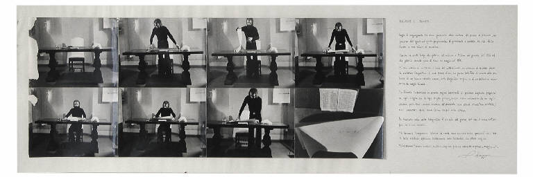 Otto fotografie disposte su due file orizzontali, con immagini in sequenza occupano due terzi dell'opera. Sulla destra un testo scritto a mano dall'artista.