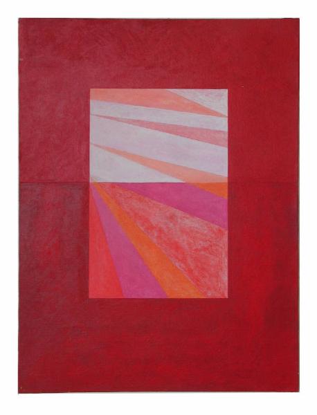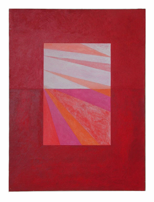 Su fondo rosso al centro un rettangolo con fasce colorate diversamente.