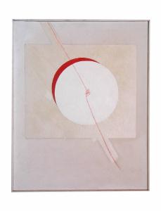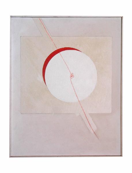 ALl'interno di un quadrato un cerchio bianco attraversato da un filo rosso.