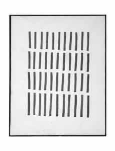Dipinto con soggetto astratto: quattro file ognuna con undici tratti neri verticali.