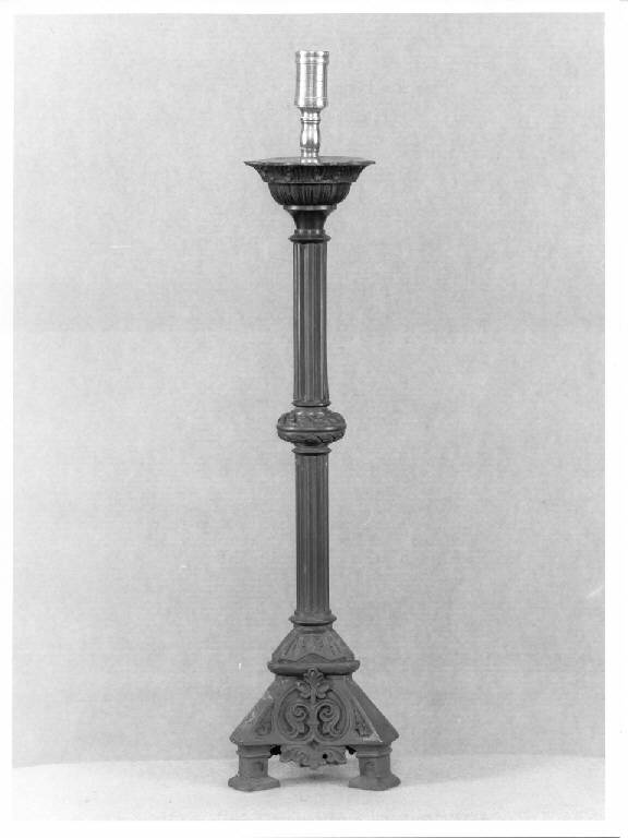 base a sezione triangolare poggiante su piedini a dado, fusto a colona rastremata con nodo a disco schiacciato, piattello a calice