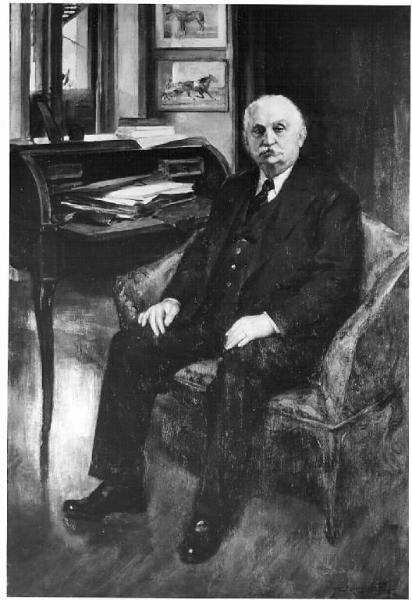 - NOTIZIE STORICO CRITICHE Il commendator Giuseppe Sesana, nato a Milano nel 1862, dopo una lunga carriera divenne uno dei più importanti industriali cartari italiani. Morì il 9 marzo 1941 e lasciò molte ricchezze agli enti assistenziali milanesi tra cui l'Ospedale Maggiore. L'esecuzione del ritratto venne affidata a Riccardo Galli il quale parla dell'esecuzione del dipinto in una lettera del 1941 inviata al presidente Venino in cui lo informa sul procedere del lavoro e sulle difficoltà incontrate a causa della scarsità del materiale fotografico. Il dipinto appartiene alla tarda attività di Galli, affermatosi fin dall'inizio degli anni Novanta come ritrattista dell'alta borghesia milanese, e presente a tutte le maggiori esposizioni artistiche nazionali di quegli anni. Il linguaggio formale del Galli si mantiene coerente con la propria matrice essenzialmente tardo ottocentesca e post scapigliata anche negli anni Trenta e Quaranta, come dimostra il ritratto in questione. Il commendatore è raffigurato nel proprio studio, seduto su di una poltrona con sullo sfondo la parete arredata con i dipinti di alcuni cavalli che alludono alla passione ippica del Sesana.