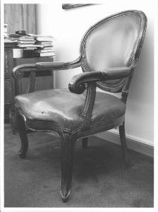 gambe leggermente curvate all'esterno, sedile imbottito, schienale ovale, braccioli rigidi