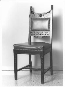 gambe rastremate a sezione quadrata con decori intagliati collegate da traversa liscia, sedile e schienale imbottito