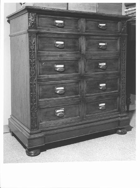 piedini a disco, doppia serie di cinque cassetti, piano leggermente aggettante