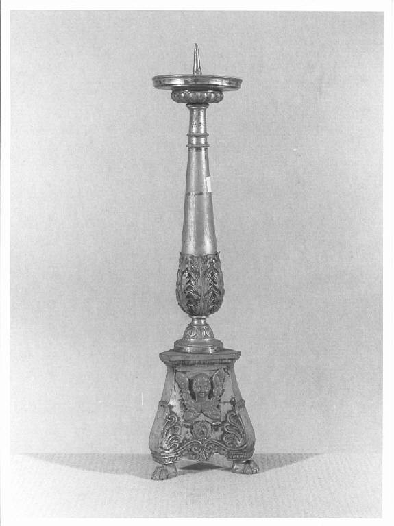 base a sezione triangolare con testina cherubica, fusto a balaustro, gocciolatoio a vaso, puntale
