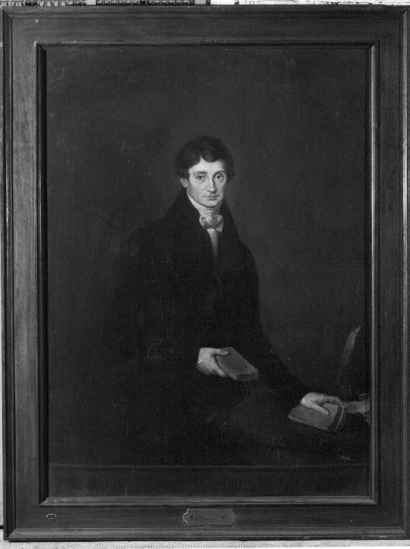 - NOTIZIE STORICO CRITICHE Il marchese Ermes Visconti nacque a Milano nel 1784, si distinse tra i teorici del Romanticismo italiano e collaborò con i suoi scritti al Conciliatore. Morì il 21 gennaio 1841 a Crema dove fu sepolto. Con disposizioni testamentarie del 31 agosto 1837 lasciò erede universale dei propri beni il fratello Giuseppe, ma legò a ciascuno degli orfanotrofi lire 53.000. Beneficò altri enti assistenziali, tra cui l'Ospedale Maggiore che lo ricordò con un ritratto eseguito da Antonio Gualdo nel 1841.\nIl pittore Pietro Narducci realizzò due ritratti del benefattore a mezza figura da consegnarsi ai due Orfanotrofi da lui beneficiati. Non si ha la certezza che quest'opera sia una di essi.