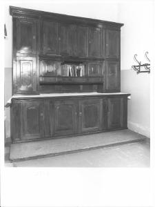 armadio a doppio corpo di cui l'inferiore più avanzato, con quattro sportelli; il superiore a cinque sportelli e serie di quattro cassetti con scomparto per libri