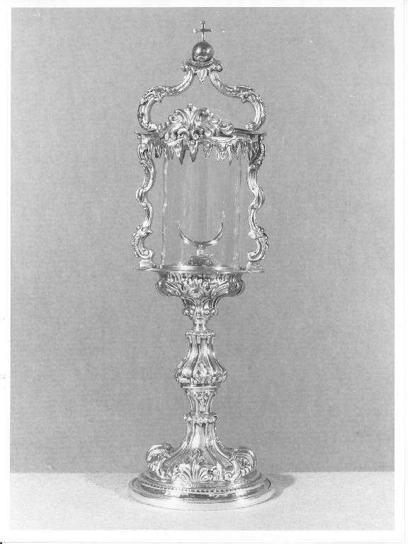 piede circolare, fusto con nodo ovoidale, teca cilindrica, fastigio a volute con crocetta apicale