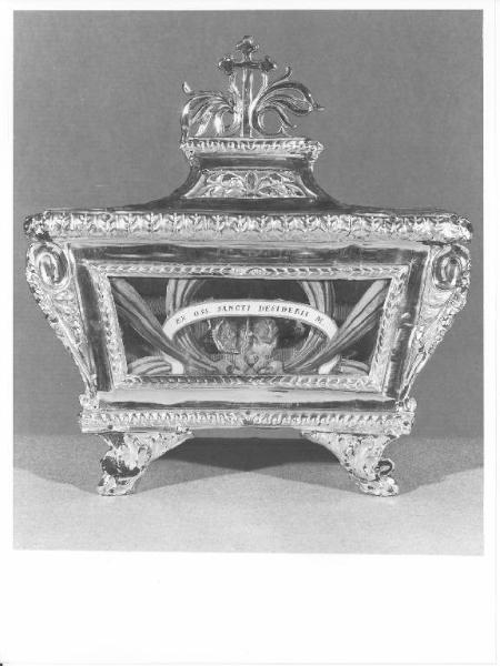 urna trapezoidale con cornici e cimasa in legno con ornati vegetali, contenente le reliquie di San Desiderio Martire