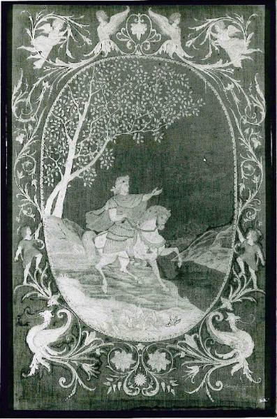 Cavaliere vicino ad un fiume con motivi decorativi a grottesche